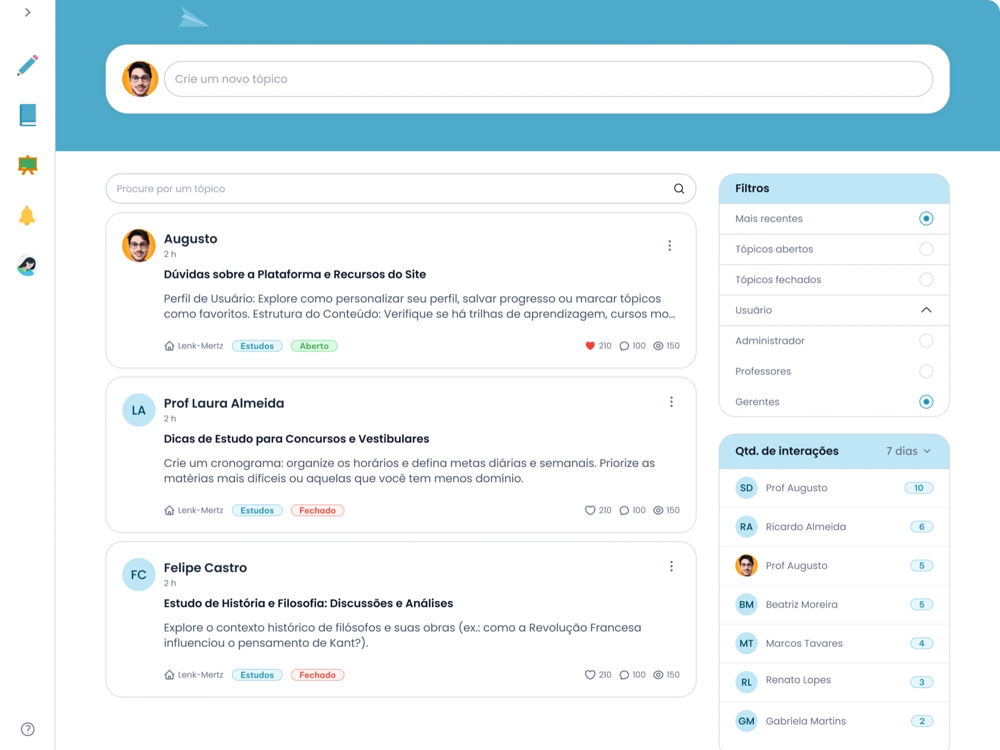 A plataforma conta com um espaço exclusivo de fórum onde professores, coordenadores e gestores podem trocar experiências, tirar dúvidas e compartilhar boas práticas.